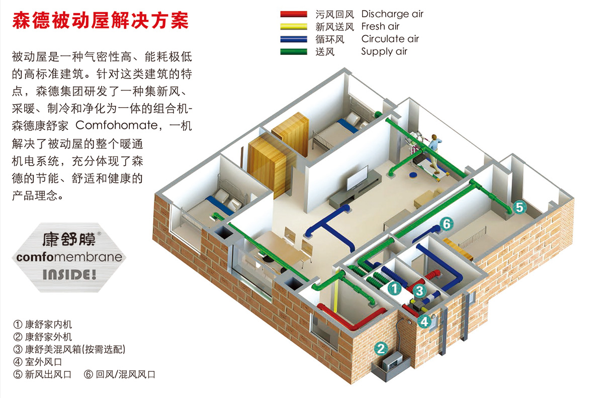 被動(dòng)式節(jié)能建筑室內(nèi)居住環(huán)境系統(tǒng)的核心, 一機(jī)多能:新風(fēng) /凈化;制冷 /制熱;除濕。